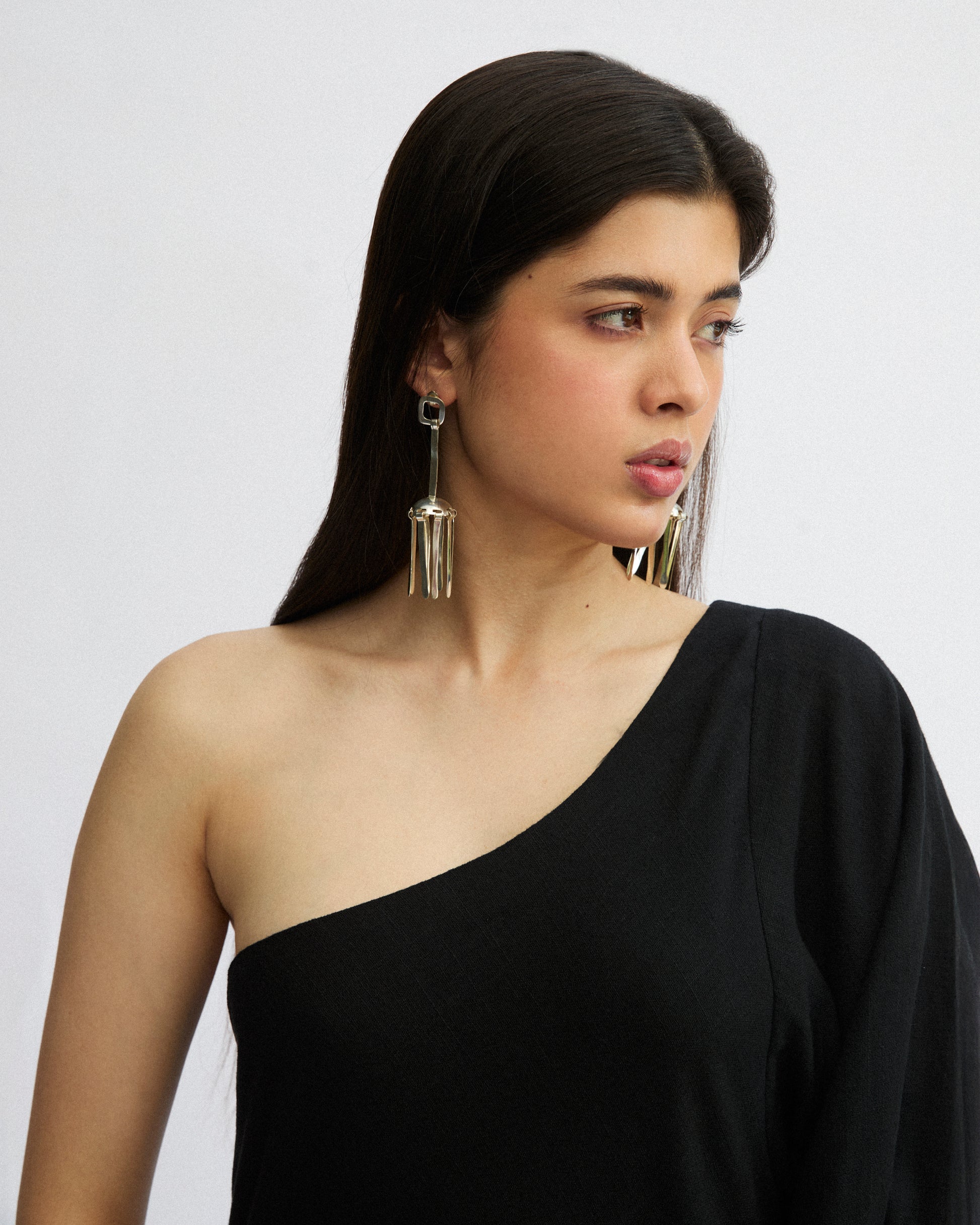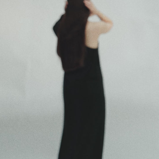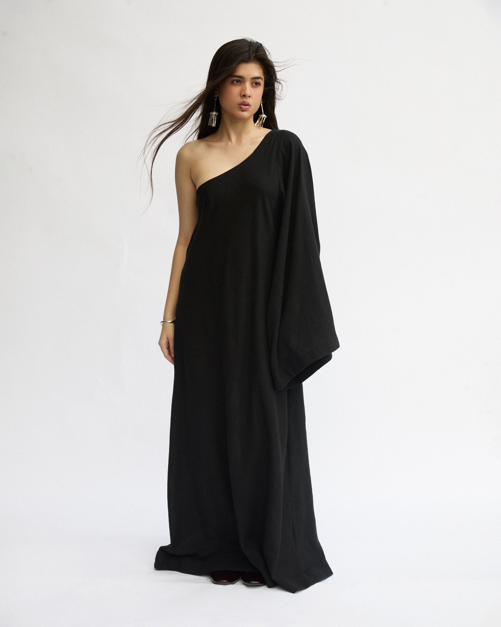 Crafted in an open-weave cotton, this black one-shoulder dress features a statement long sleeve on one side and a clean, strapless cut on the other. Lightweight and breathable.