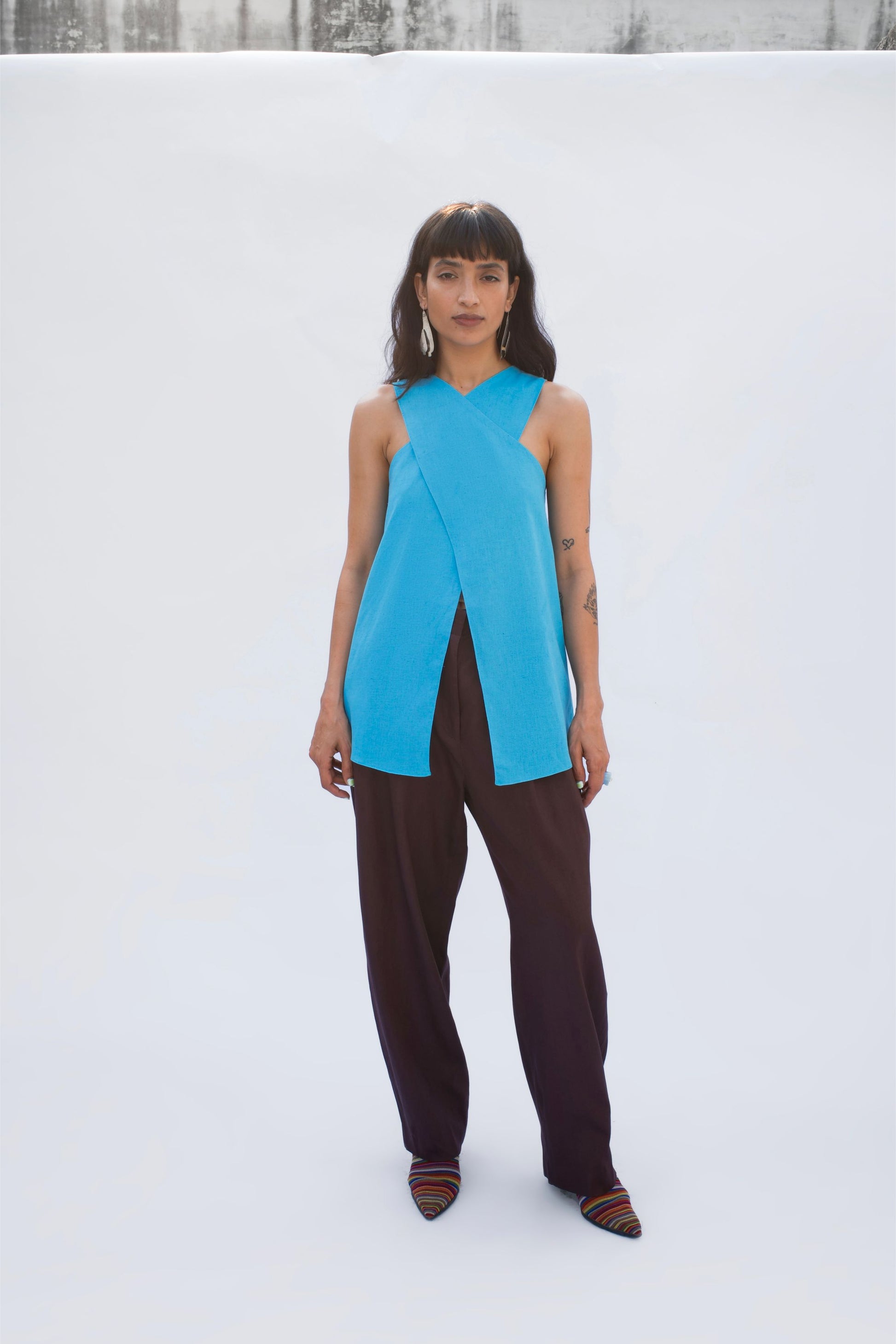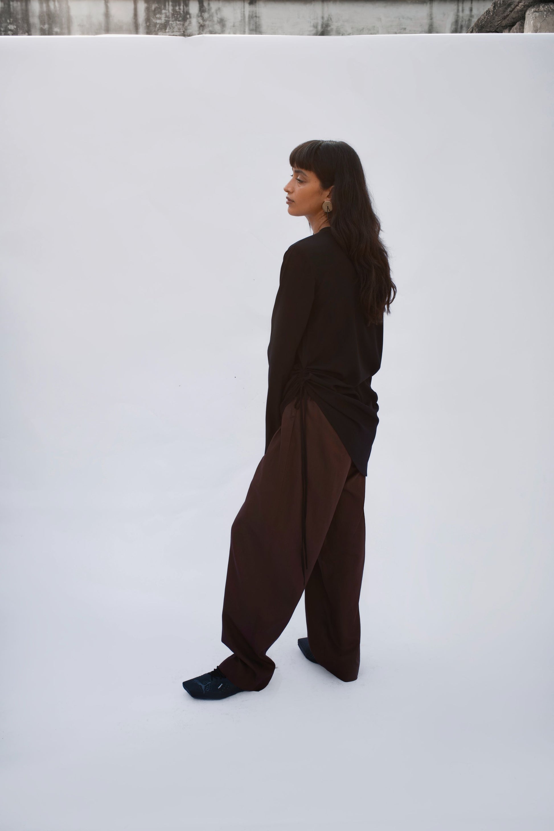 Loose fit linen trousers in a deep brown shade with front pleats and elastic on the sides for a comfortable fit.