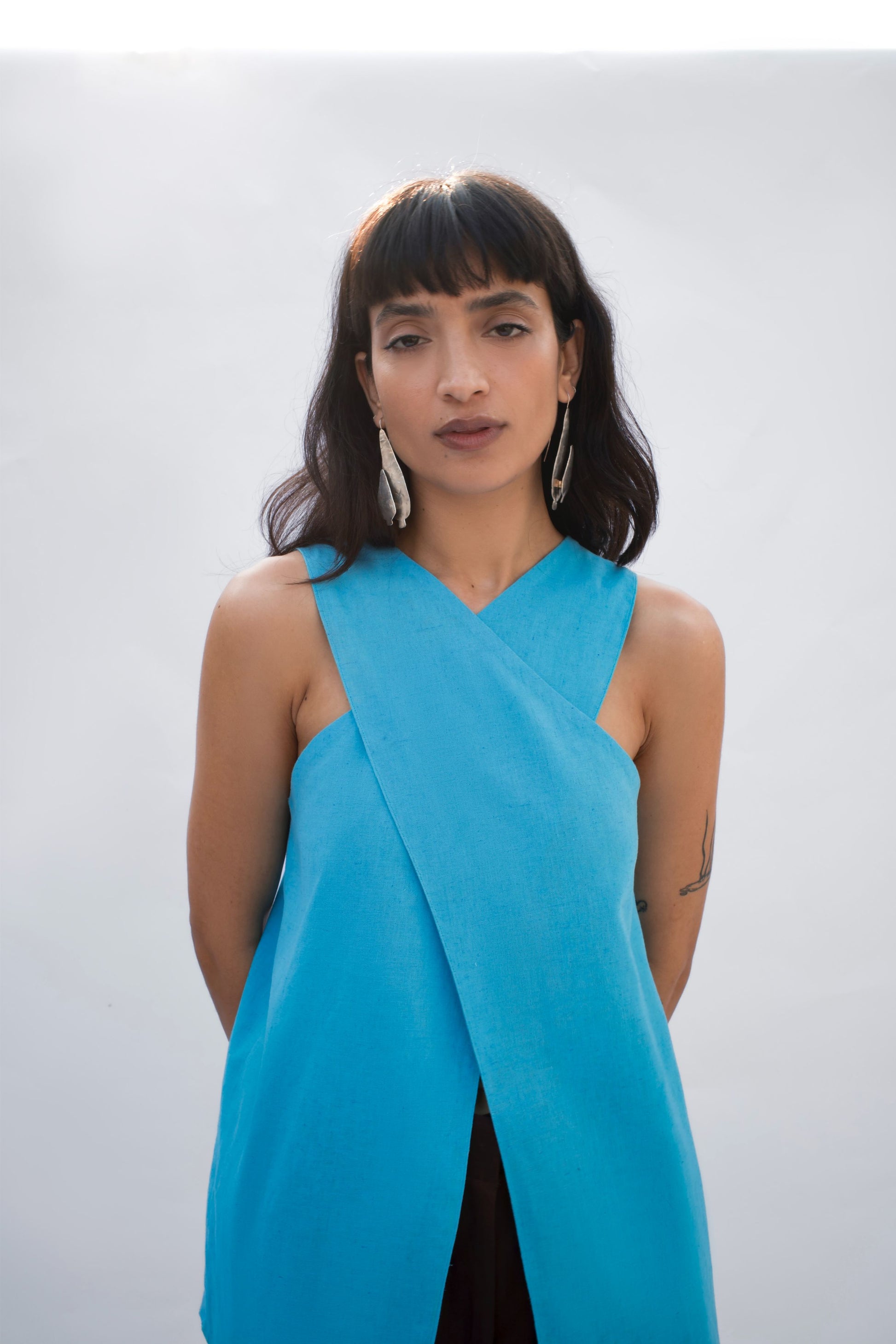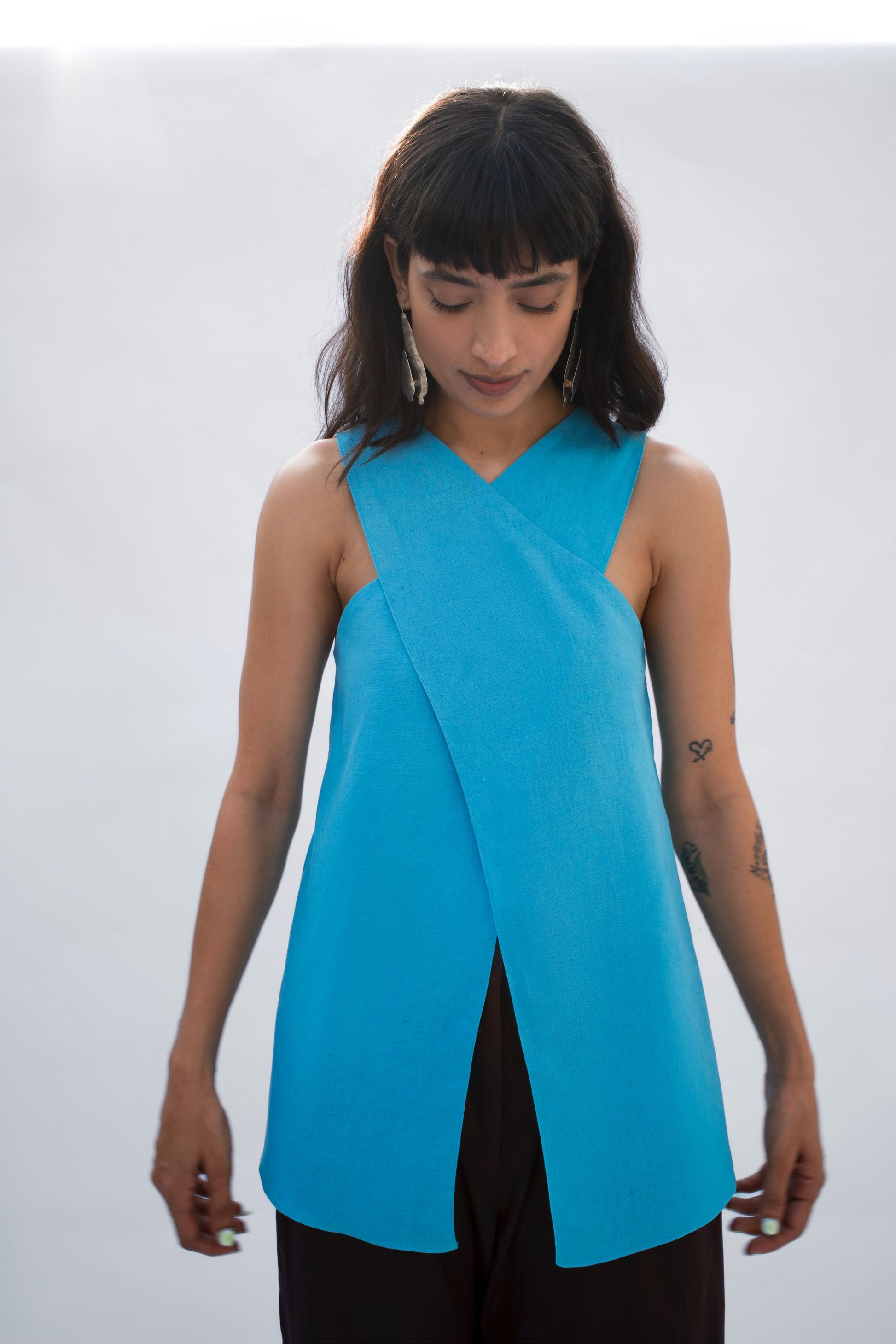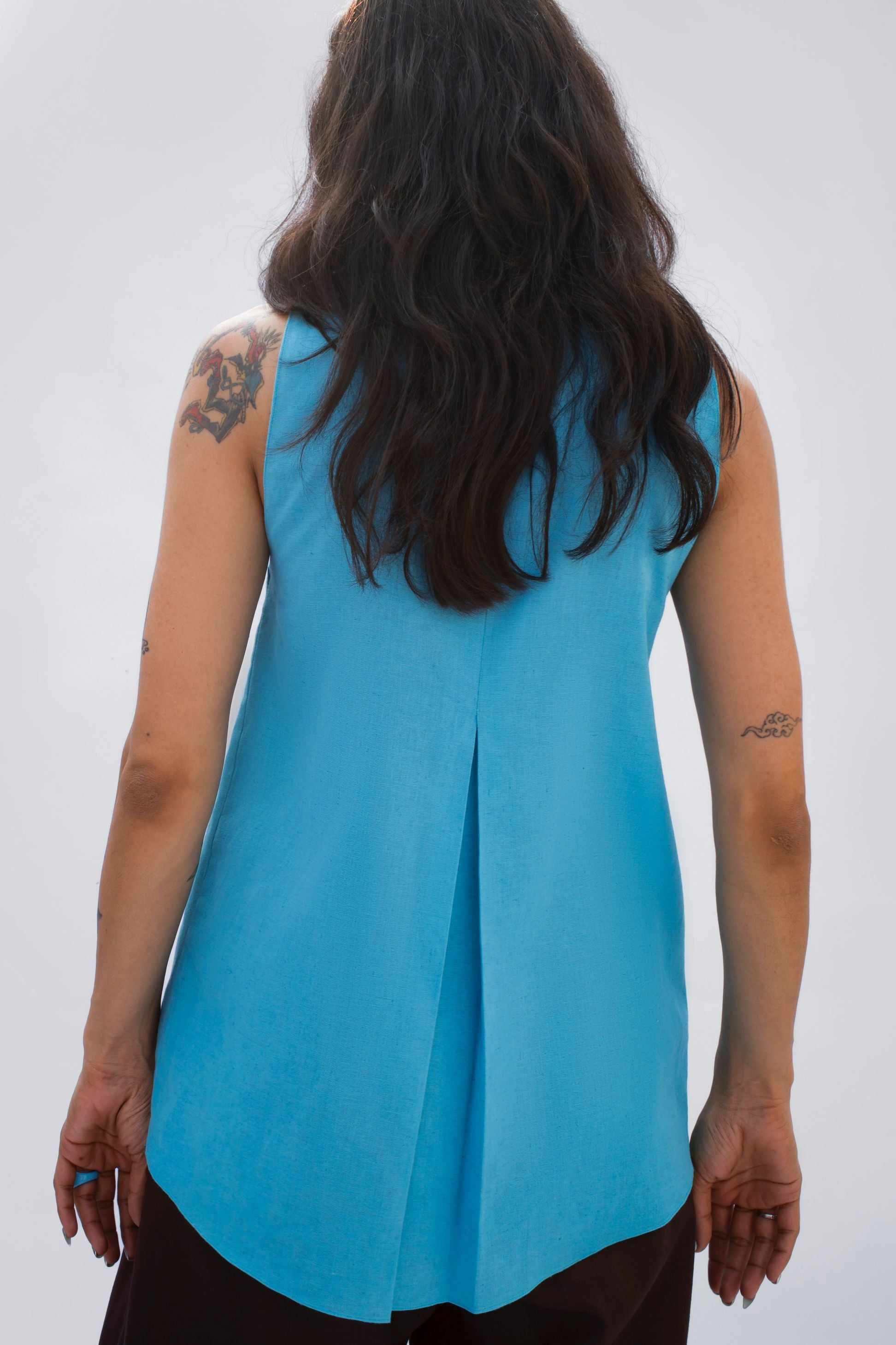 A sleeveless linen top in a vivid blue, crafted with a cross-over neckline and a front slit that adds ease of movement. The back features a soft inverted pleat for flow and comfort.