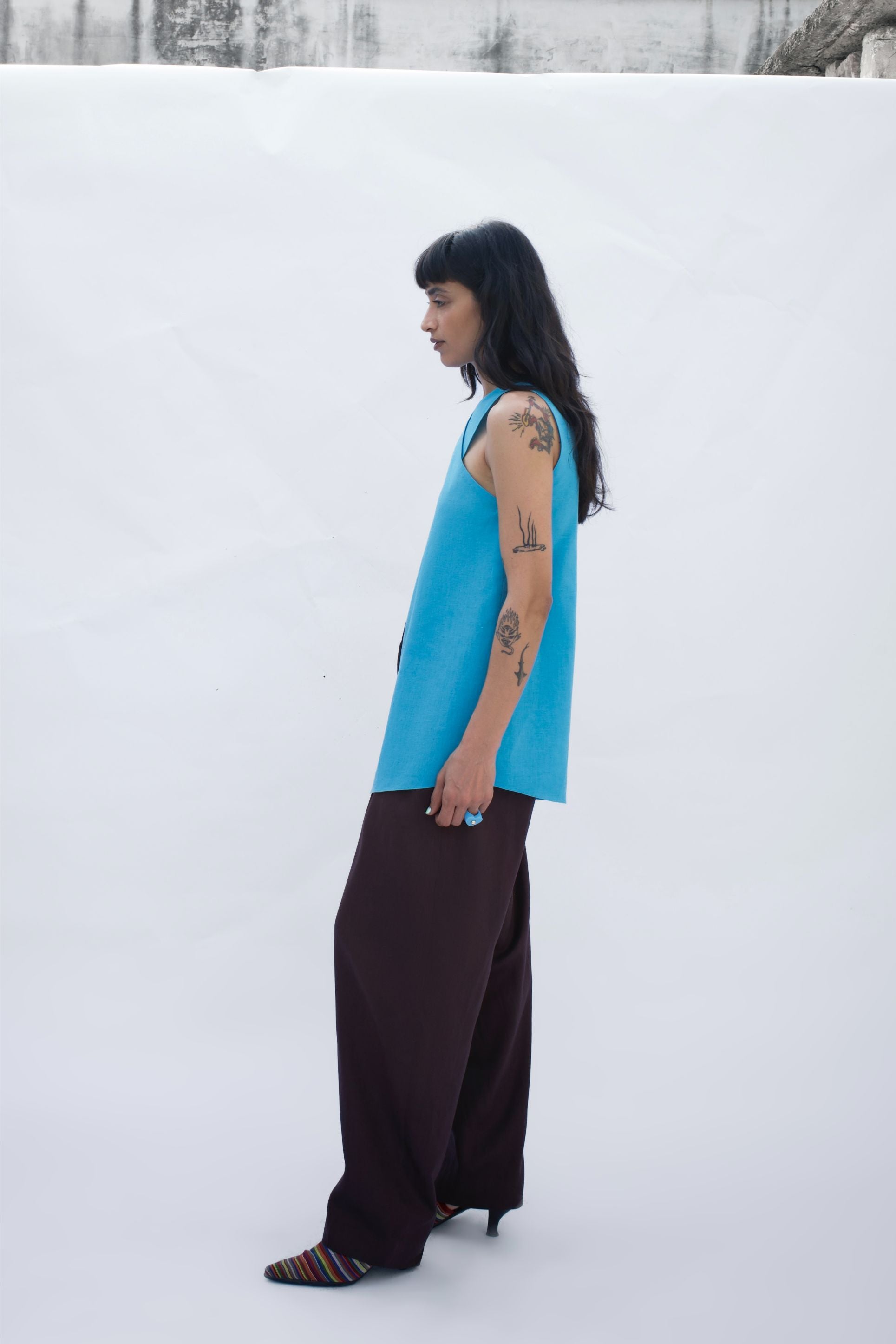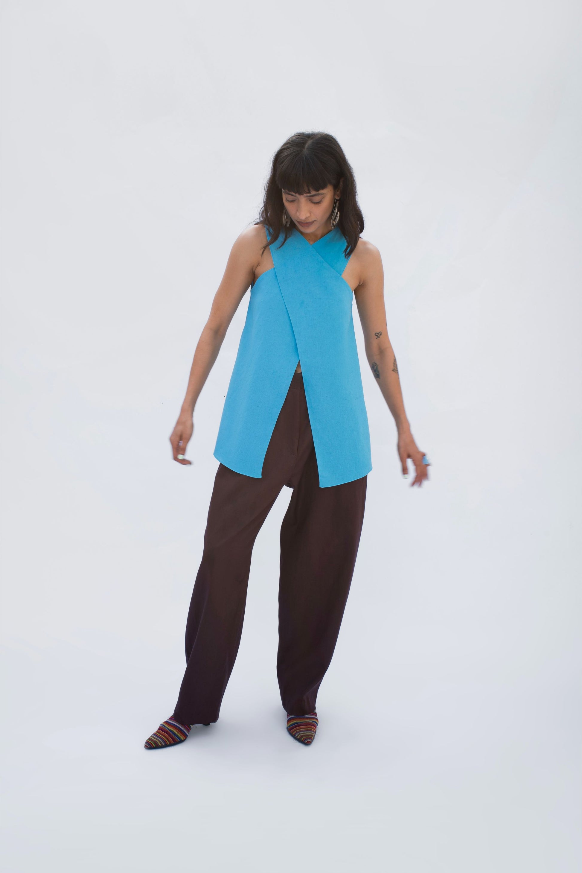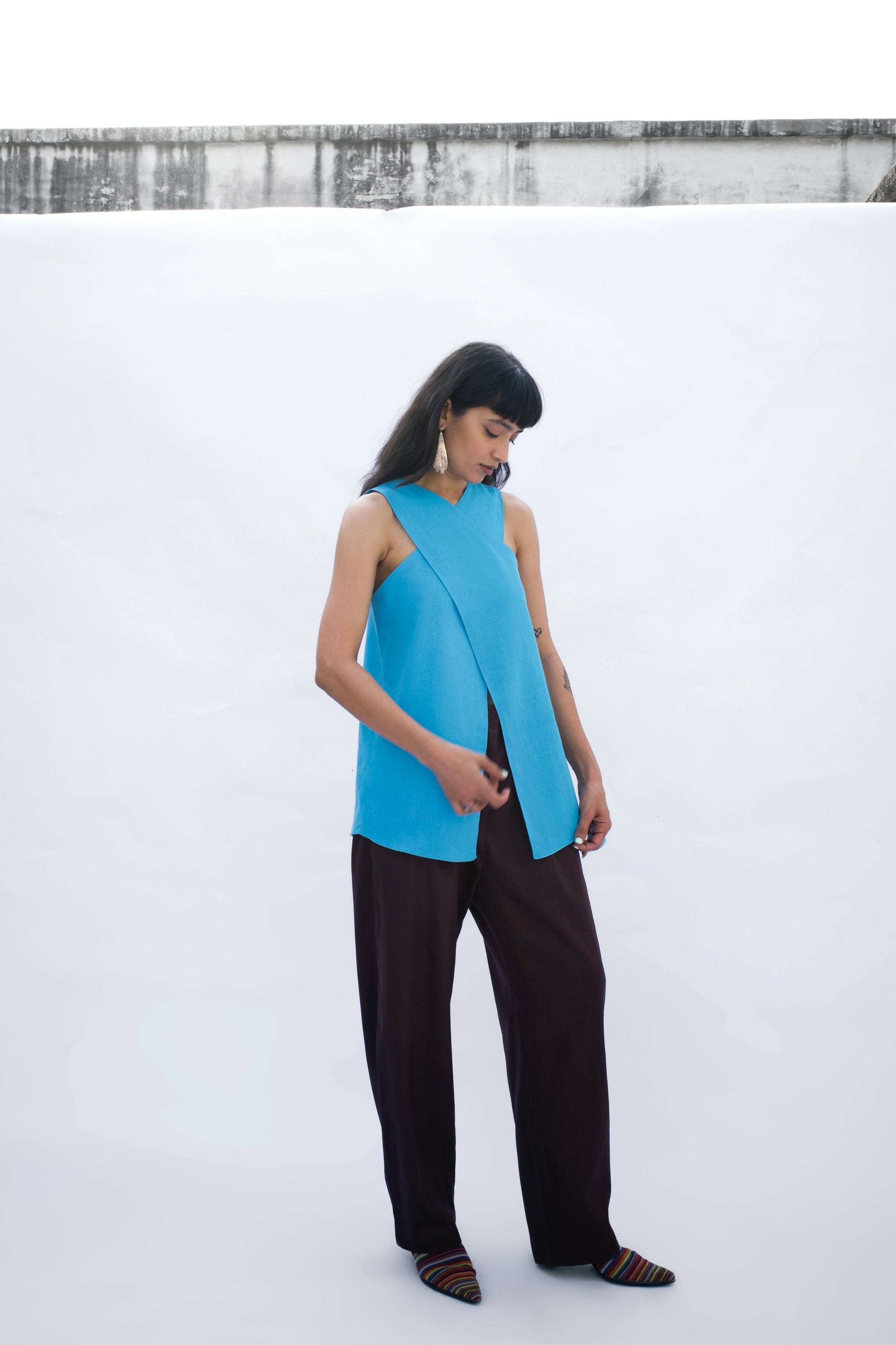 A sleeveless linen top in a vivid blue, crafted with a cross-over neckline and a front slit that adds ease of movement. The back features a soft inverted pleat for flow and comfort.