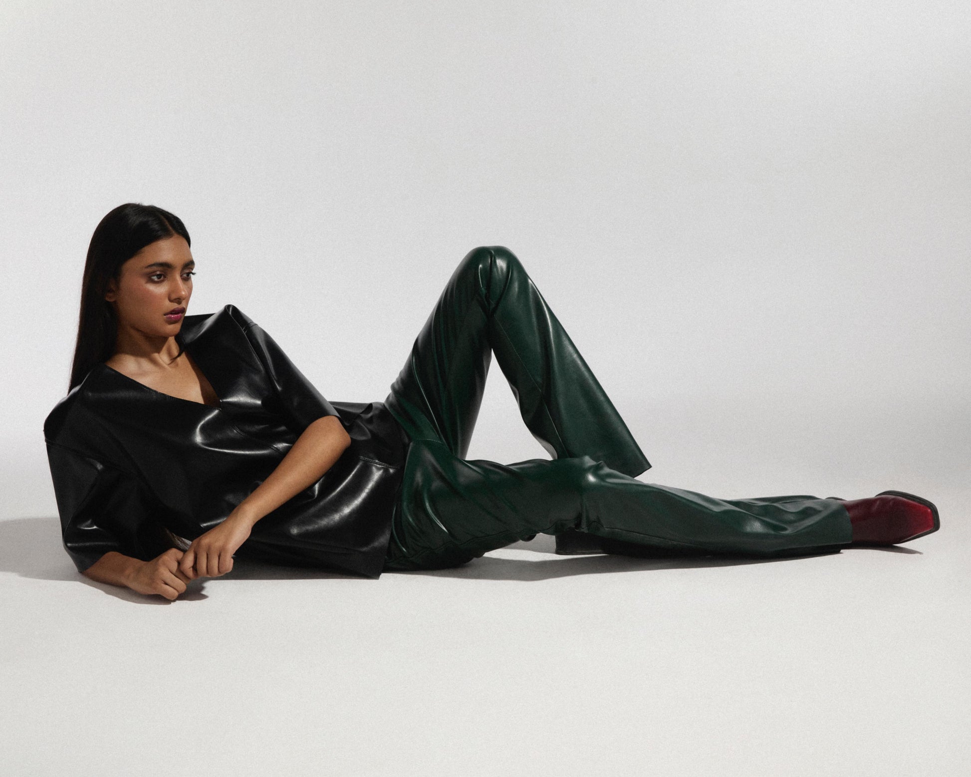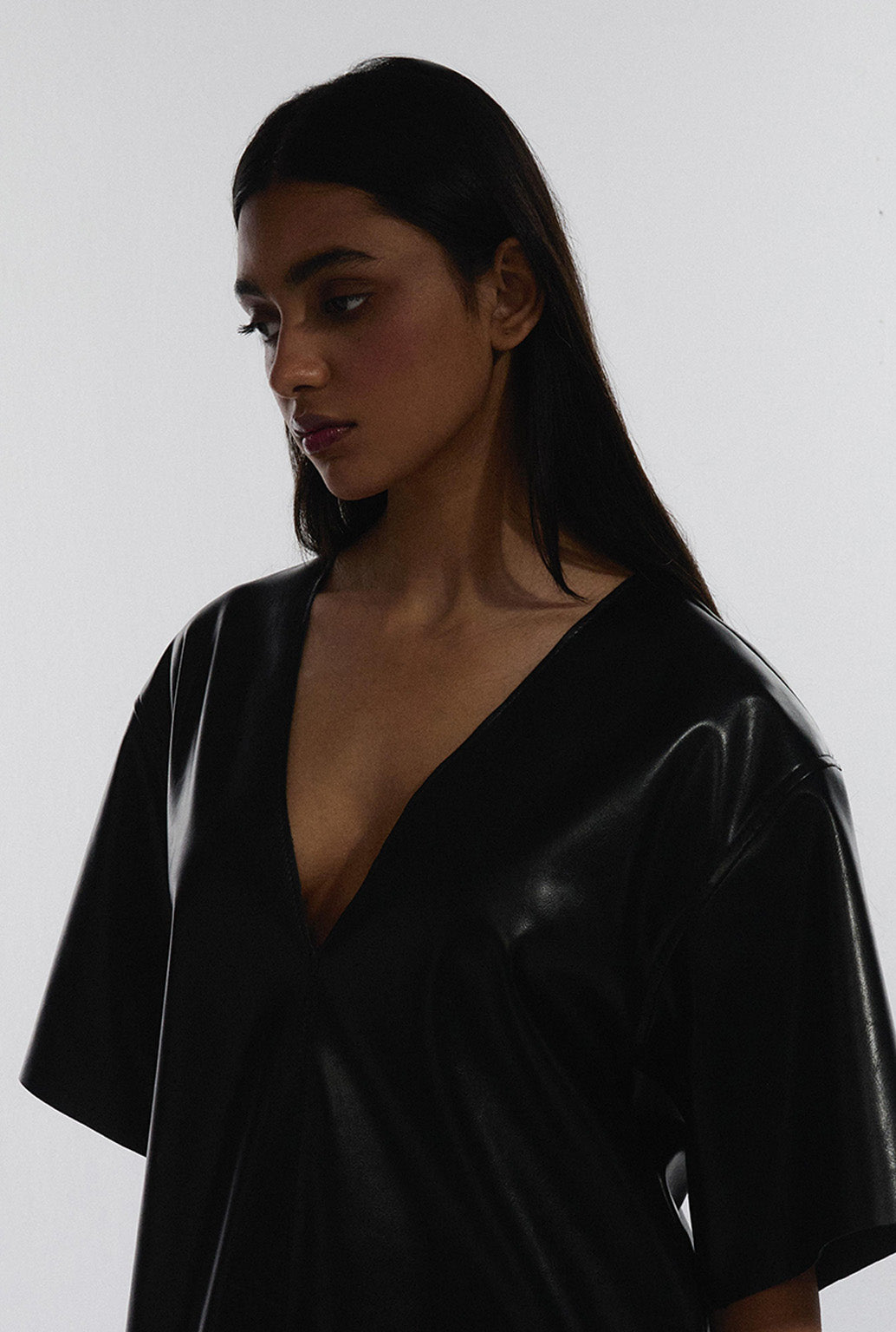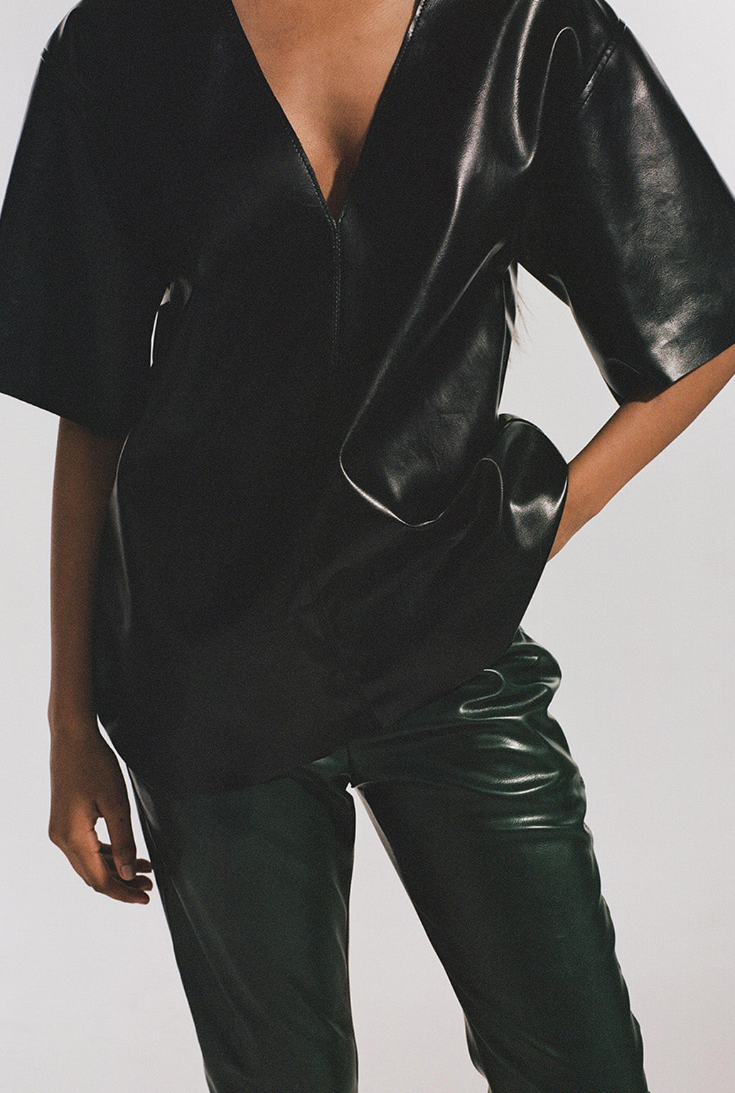 The V top is crafted in supple faux leather with a deep V-neckline and relaxed drop shoulders.
