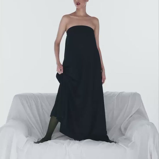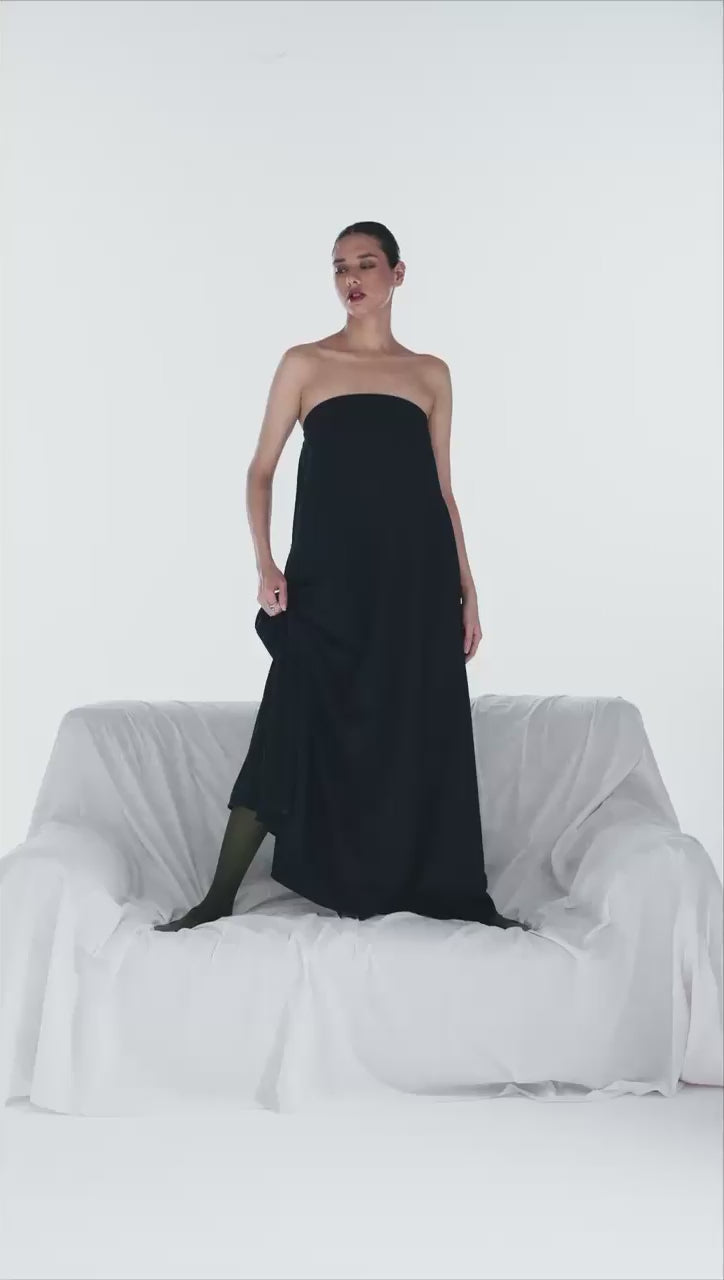 A strapless floor length dress made from suiting fabric, cut in a relaxed and flowing shape.