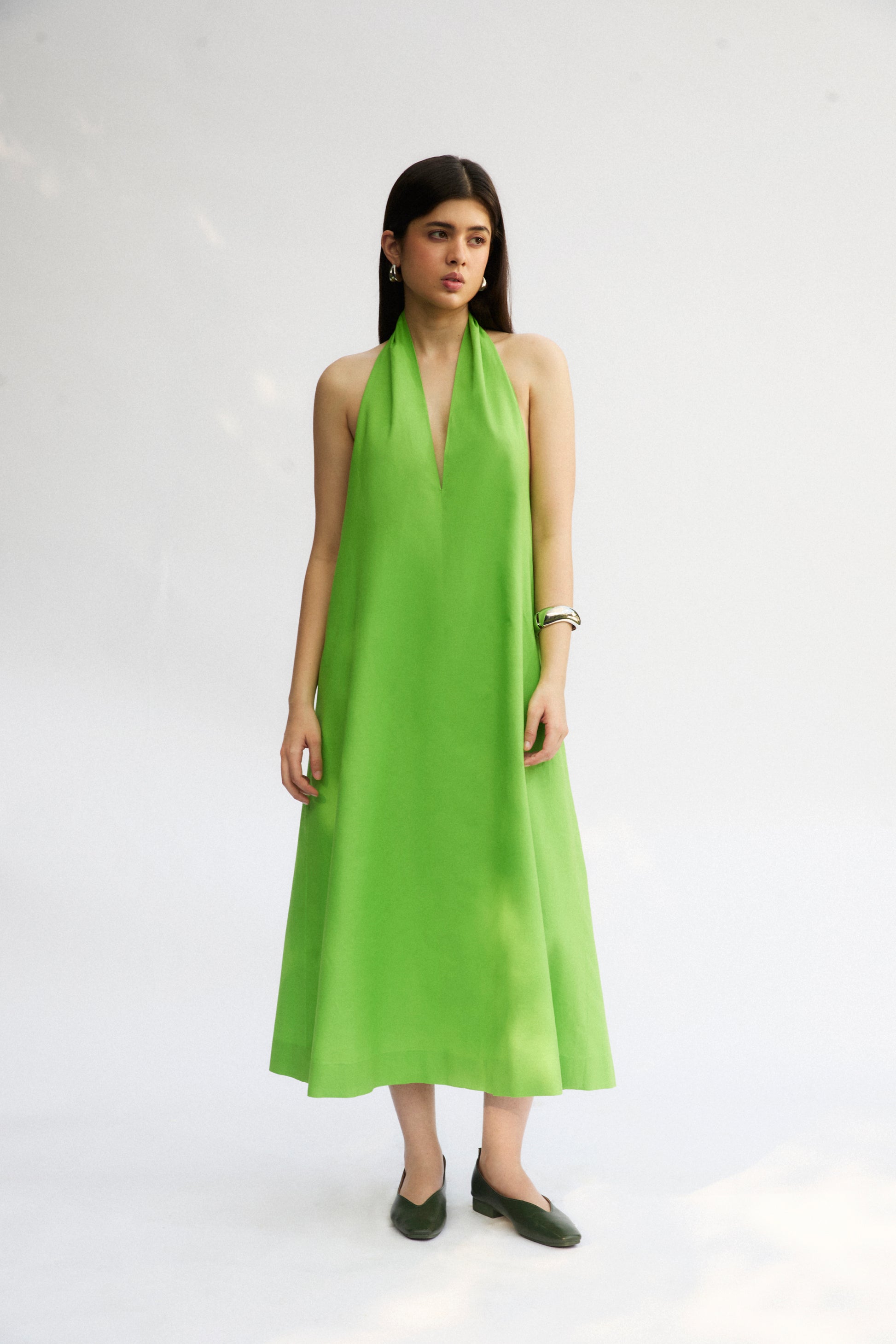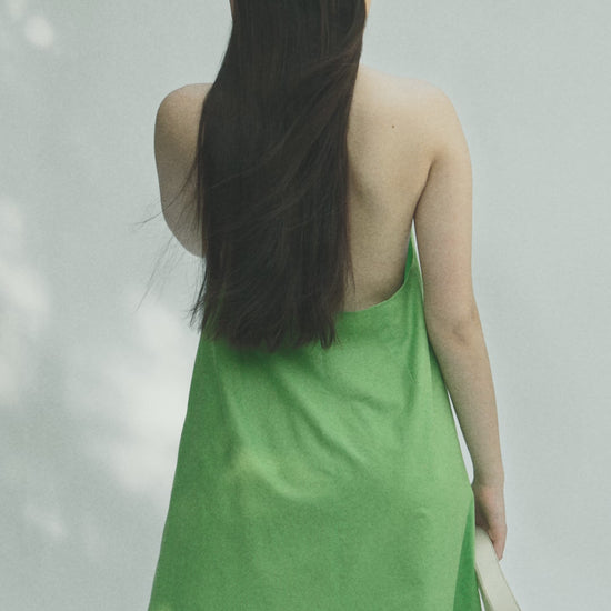 A halter neck dress cut in linen, dyed in a bold lime green. Designed with a low back and an added elastic detail for a more secure and flattering fit (not shown in image).