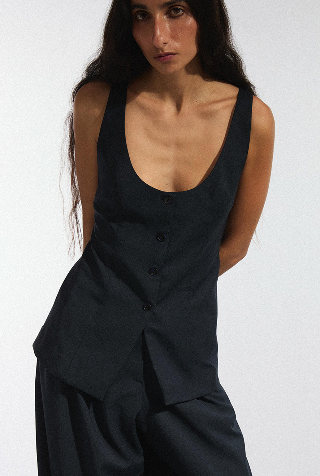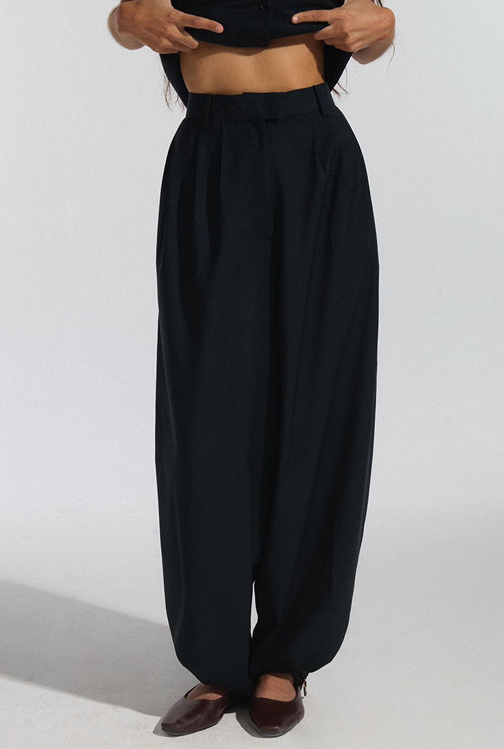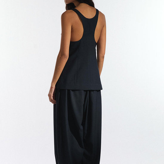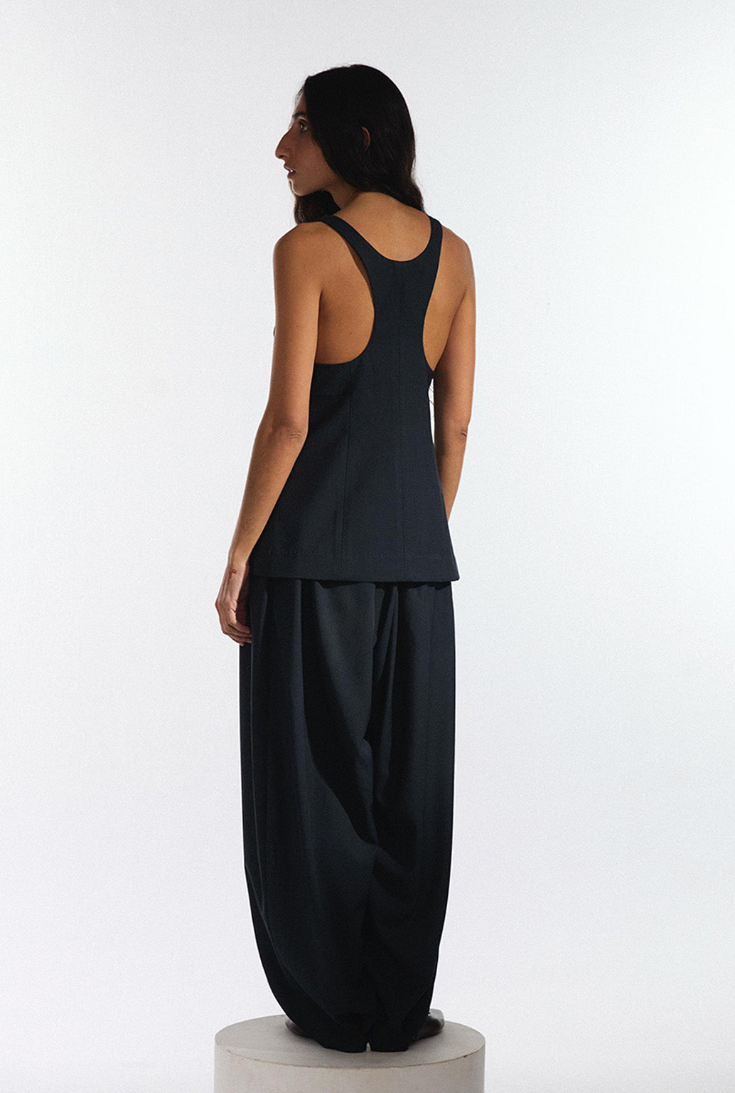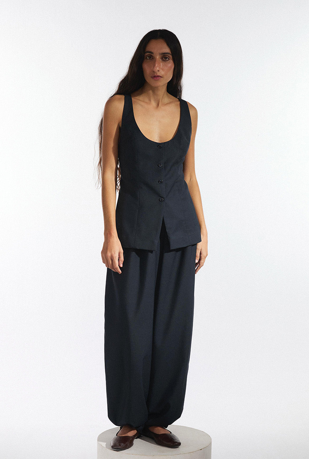 Tailored sleeveless top with a scoop neck and front slit, paired with relaxed balloon trousers in a deep inky hue.