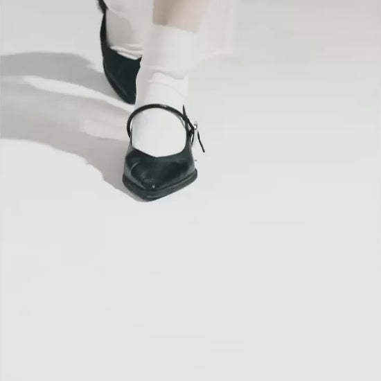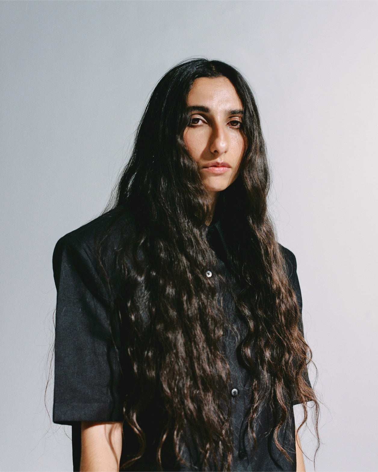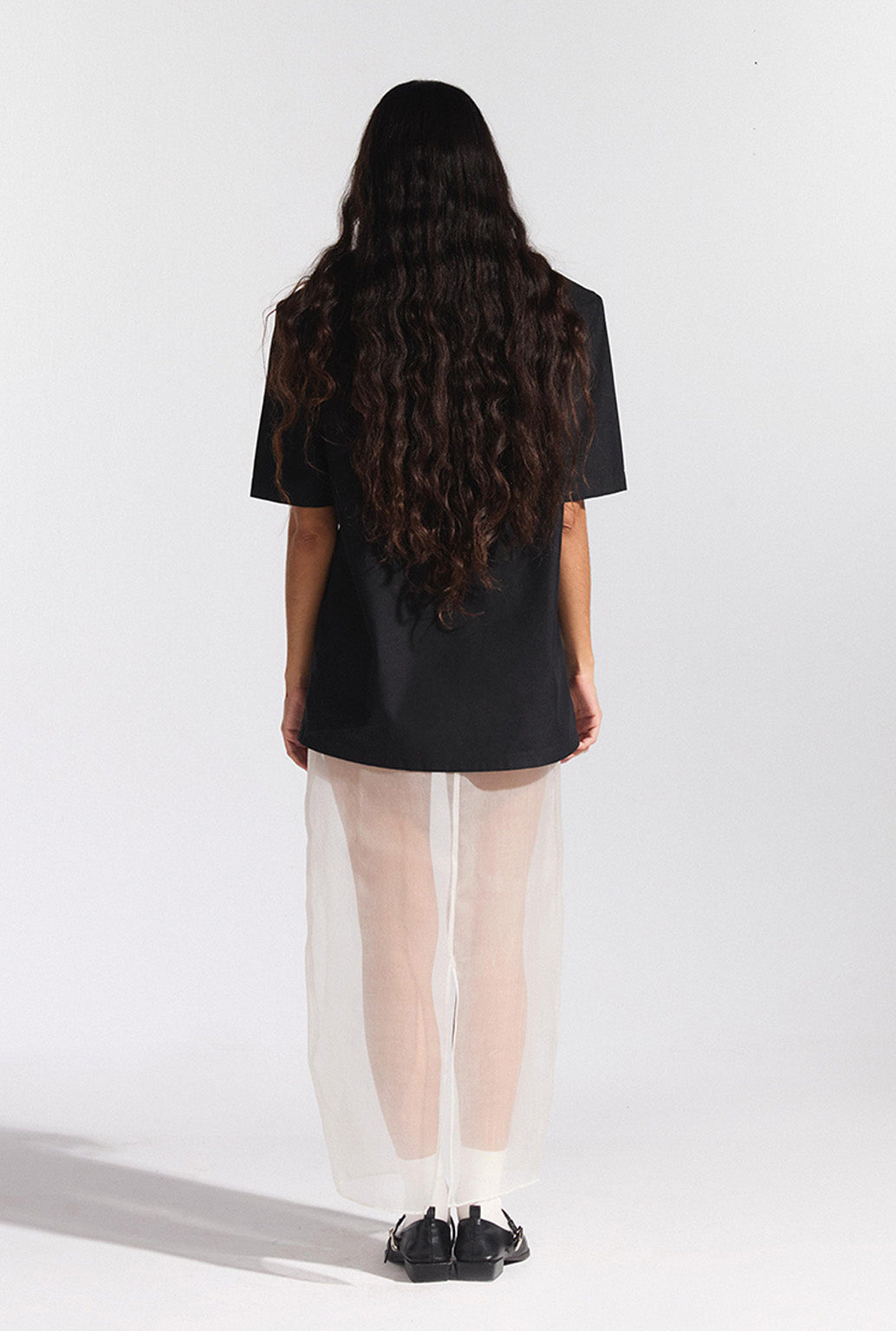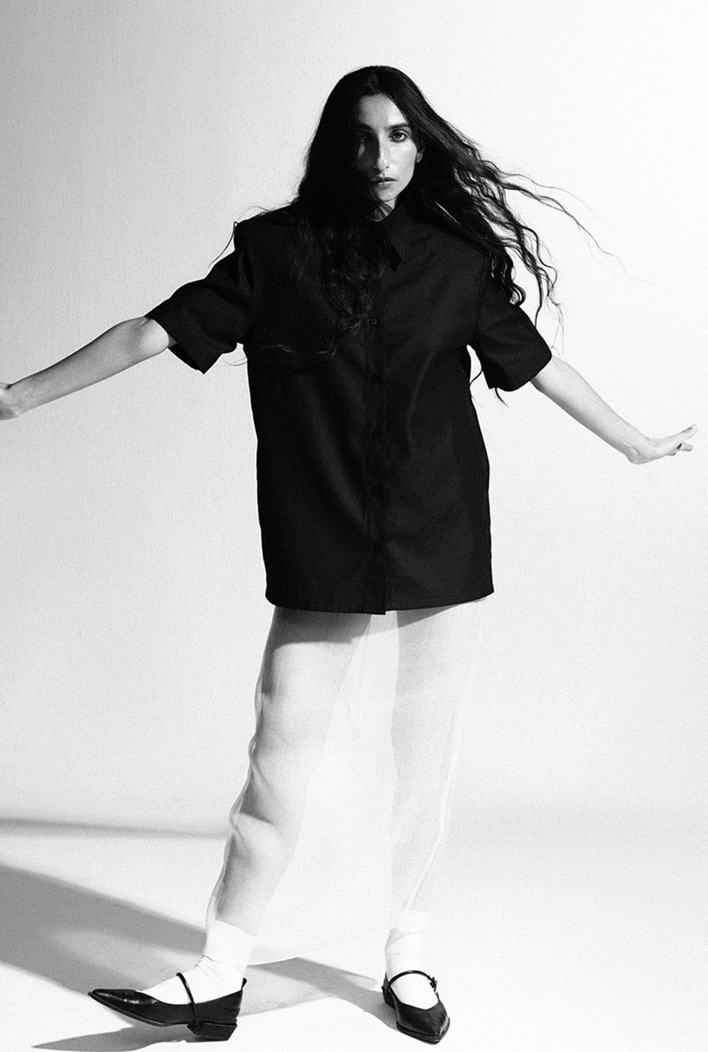 An oversized black cotton shirt with a sharp collar and padded shoulders.