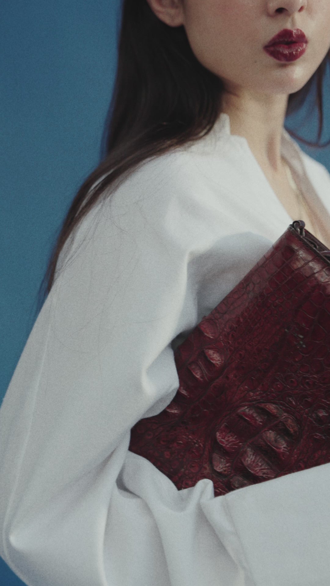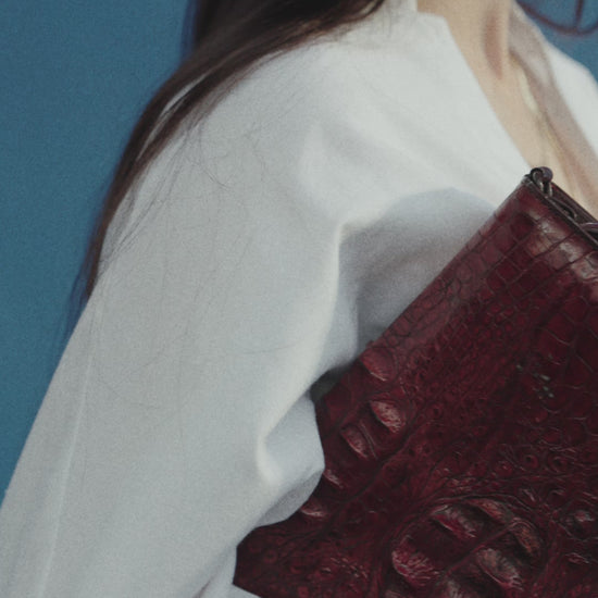 A relaxed white linen set featuring a deep V-neck shirt with a band collar and loose, oversized sleeves. Paired with a matching straight-cut skirt for an laid-back silhouette.